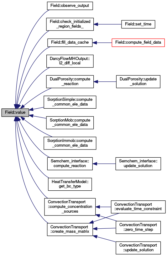 By "field" we mean a mapping of a a pair (Point, Time) to a Value, where Point is from spacedim dimensional ambient space, Time is real number (set by set_time method), and Value type representing range of the field, which can be: real scalar, integer scalar (a discrete value), real vector of fixed (compile time) size, real vector of runtime size, or a matrix of fixed dimensions. Extensions to vectors or matrices of integers, or to variable tensors are possible. For vector and matrix values we use classes provided by Armadillo library for linear algebra. The Value template parameter should FieldValue<> template, usual choices are: FieldValue<spacedim>::Scalar, FieldValue<spacedim>::Integer, FieldValue<spacedim>::Enum, FieldValue<spacedim>::VectorFixed, FieldValue<spacedim>::TensorFixed.